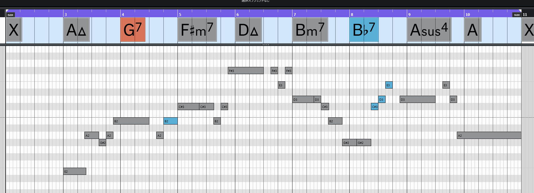 7小節目から9小節目かけてのツーファイブワンの動きですが、せっかく裏コードの勉強中ですからファイブの裏コードを用いて半音加工の連続にしてみるのもいいと思います。
