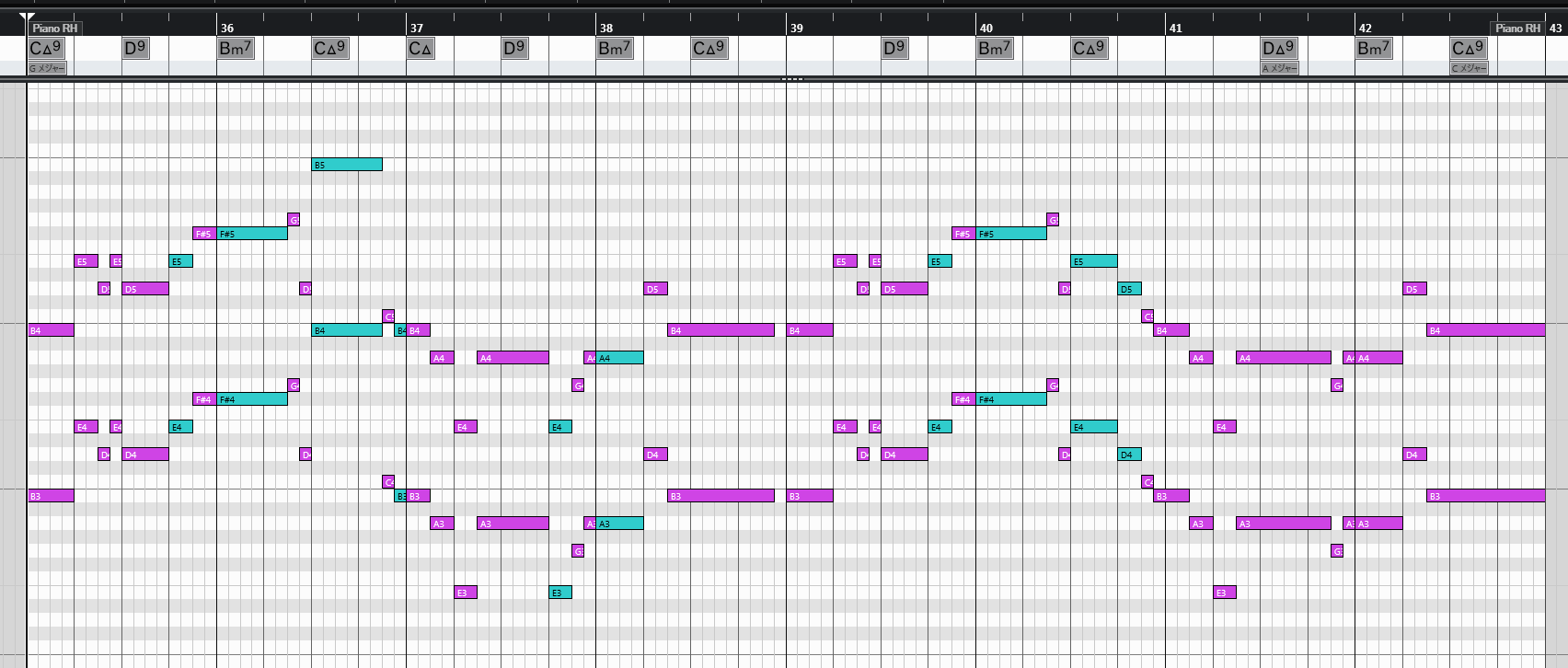 小節のアタマで弾き直しているところがいくつかありました。ピアノという楽器は一度弾いたらあとは減衰していくだけですが、音量が再び大きくなるということは、「同じ音をもう一度弾いている」ということになります。ですのでアタックの瞬間の音が捉えられなくても、音量の推移で判断がつくこともあるので、覚えておくといいと思います。