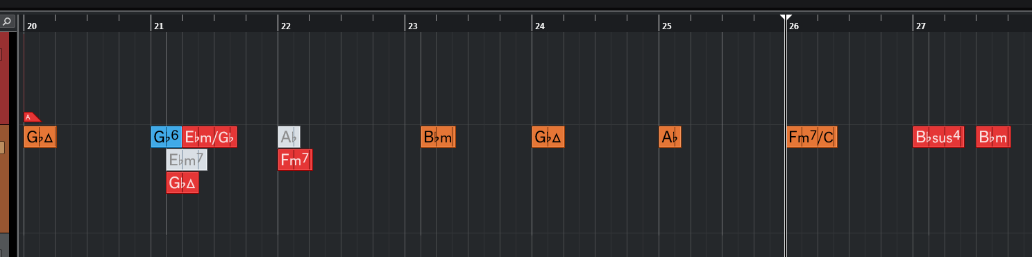 ただここは明らかにシンコペーションしています(ベースも一緒に動いているし、ドラムも合わせている)。つまりアレンジ上明らかに2拍目のウラでコードチェンジしているので、Bbmは8分音符ひとつ前に置きましょう。