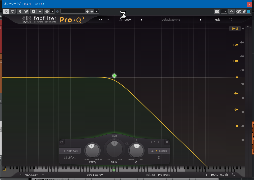 あと前回聴き逃していましたが、その手前のm26も違っています。ここは分数ではなくて、単にFm7です。ベースがファです。恐らくボーカルのドに耳が引っ張られたのだと思います。EQのローパスフィルターで400Hzあたりから上をー12dB/oct.の穏やかなカーブで切り落としてやるとベースの音に集中し易いと思います。こんな感じ。